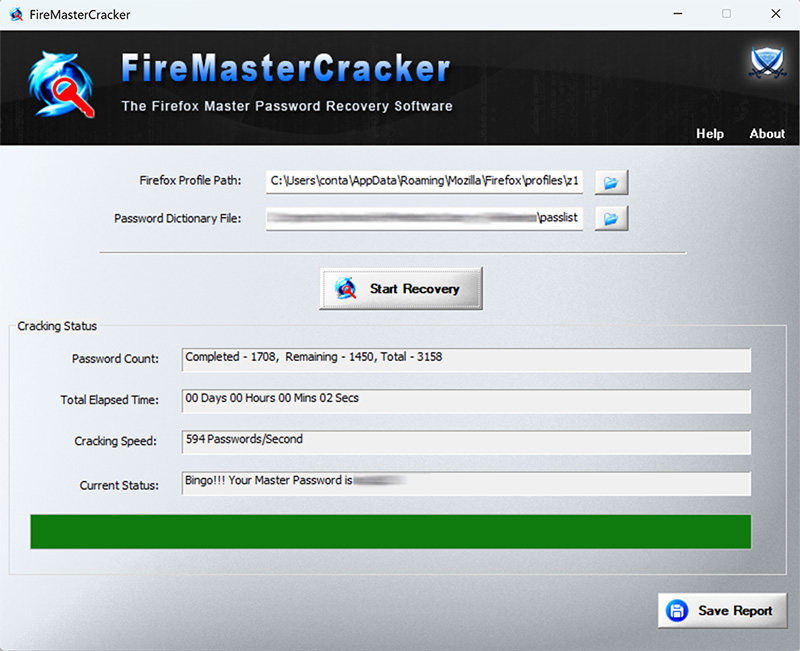 FireMasterCracker is the FREE software to recover your lost or forgotten Master Password of Firefox (all versions). It is the GUI version of FireMaster, first ever tool created to recover the Master Password of Firefox.